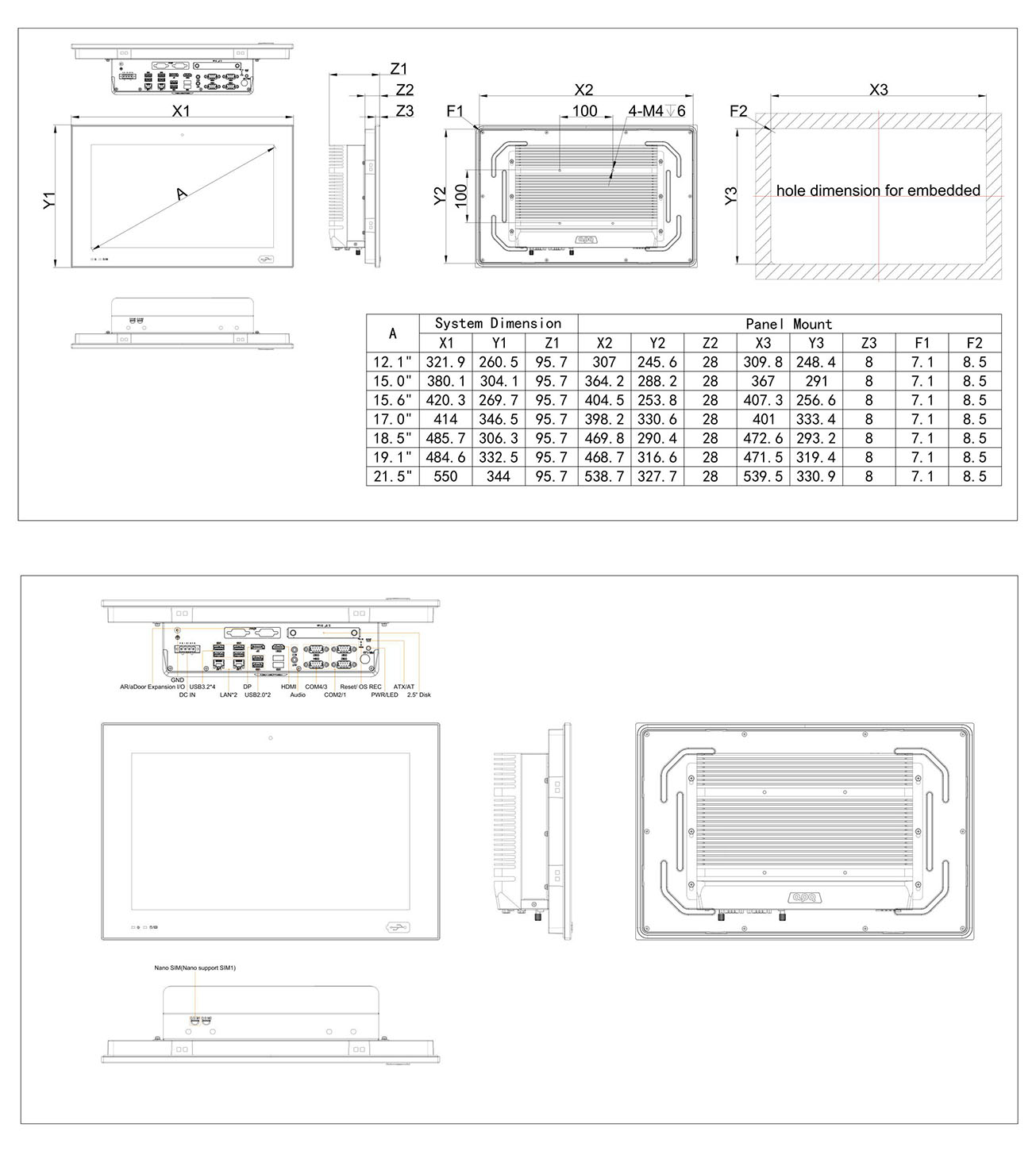 | Màn hình LCD | Kích thước hiển thị | 12,1" | 15.0" | 15,6" | 17.0" | 18,5" | 19,1" | 21,5" |