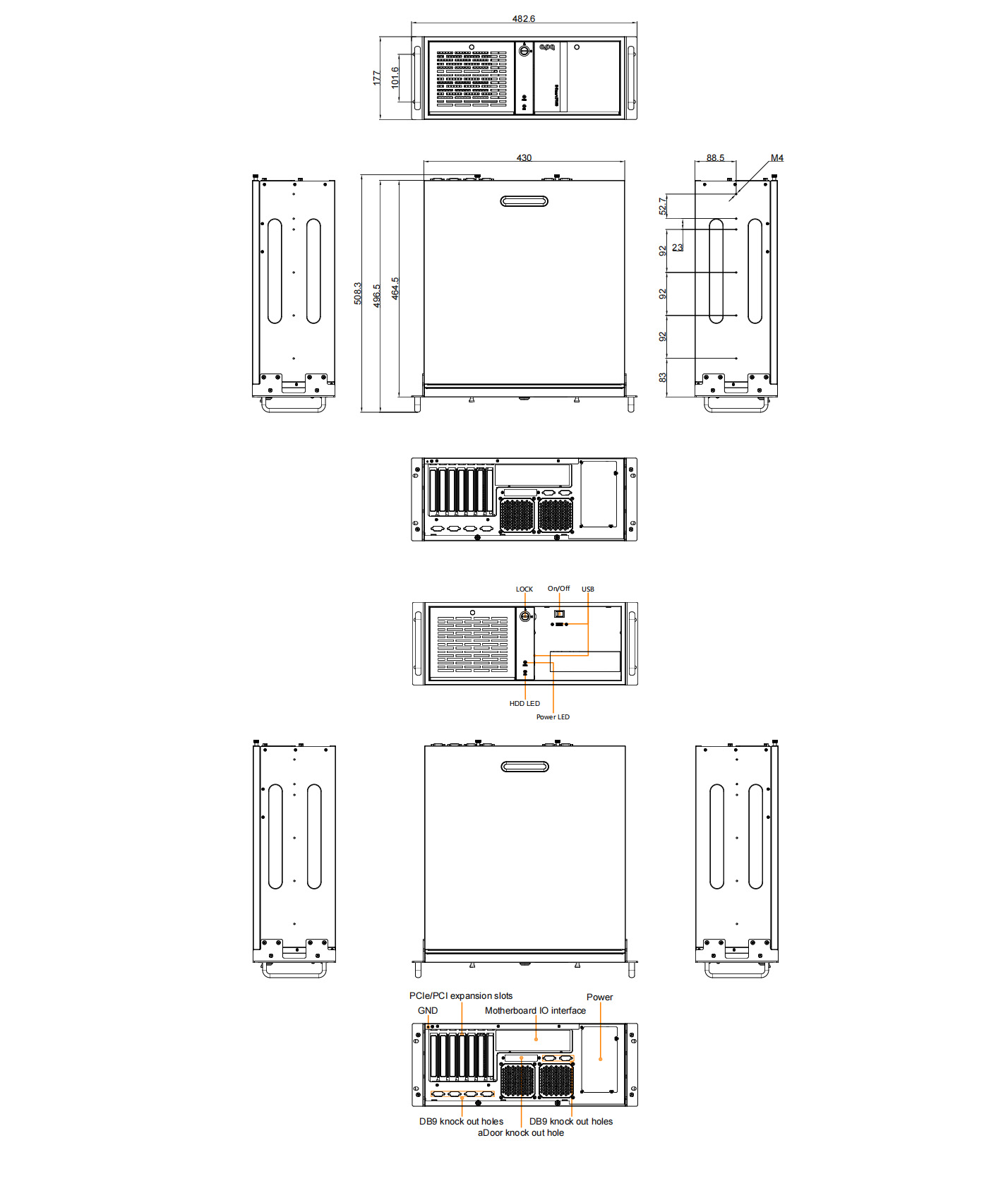 | Optional | 6 * DB9 knock out holes (Front I/O)1 * aDoor knock out holes (Front I/O) | |