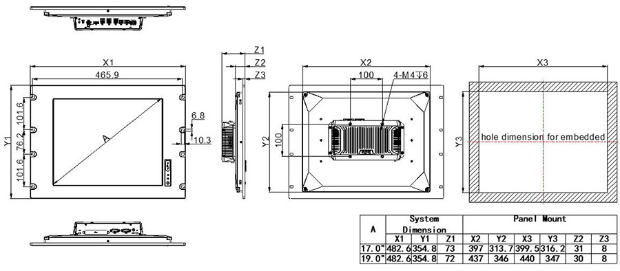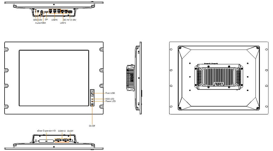The APQ resistive touchscreen industrial all-in-one PC PGxxxRF-E5S series on the J6412 platform is a high-performance industrial computer that features a resistive touchscreen design. It offers modular design choices with screen sizes of 17/19 inches, supporting both square and widescreen displays. The front panel meets the IP65 protection standard, ensuring stable operation in harsh environments. Integrated on the front panel are a USB Type-A port and signal indicators for easy operation and monitoring by users. Powered by the Intel® Celeron® J6412 low-power CPU and equipped with dual Intel® Gigabit network cards, it supports dual hard drive storage and can be expanded with APQ aDoor modules and WiFi/4G wireless capabilities. Its fanless design ensures silent operation and stable performance. The device offers options for rack-mount or VESA mounting to meet the installation needs of various situations. With a 12~28V DC power supply design, it is suitable for a range of industrial settings.